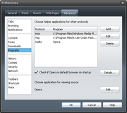 | 18:08, 9 July 2008 | Opera preferences programs.PNG (file) | 29 KB | Woutermense | The opera preferences window with the programs tab opened | 1 | |
